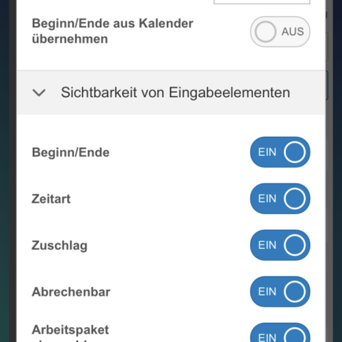 Die Maske „Neue Zeiterfassung“ lässt sich über das Zahnrad-Icon am oberen Bildschirmrand noch personalisieren und vereinfachen, indem nicht benötigte Felder ausgeblendet werden.