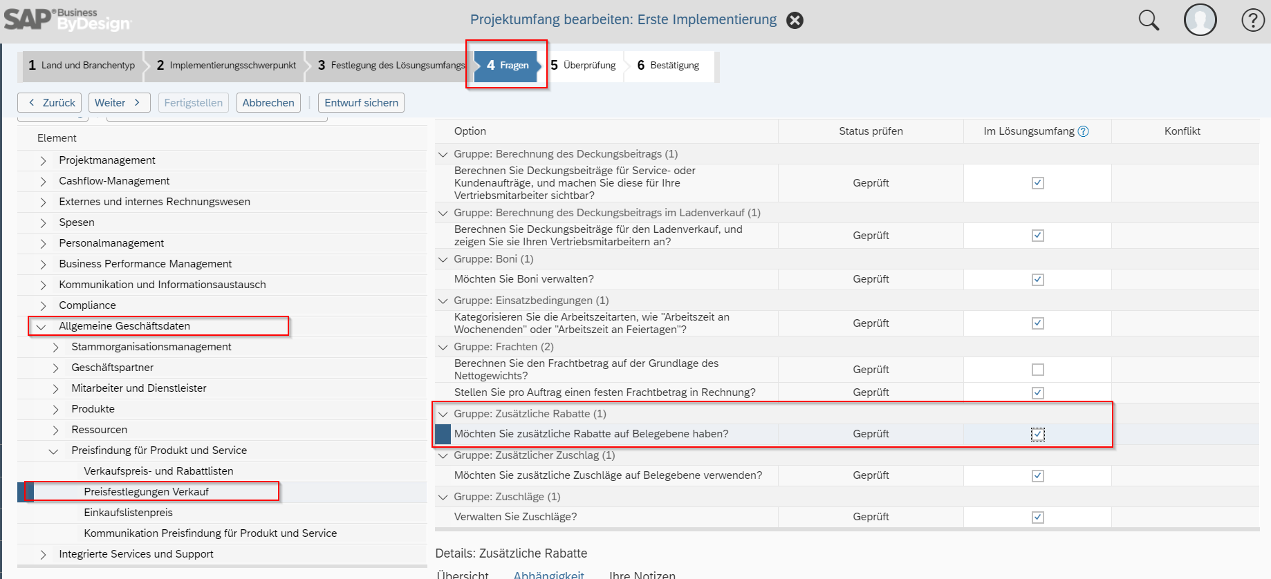 Das Aktivieren der Funktion geschieht über das Work Center „Betriebswirtschaftliche Konfigurationen“ im Implementierungsprojekt. In der Übersicht ist der Reiter „Projektumfang bearbeiten“ zu finden. Die Schritte eins bis drei können durch Betätigen des Reiters „weiter“ übersprungen werden und unter Punkt vier kann die neue Funktion aktiviert werden. Dazu navigiert der User zum Oberpunkt „Allgemeine Geschäftspartner“ und klappt den Punkt „Preisfindung für Produkte und Service“ auf. Auf der rechten Bildschirmhälfte werden alle Fragen, zu dem Punkt „Preisfindung für Produkte und Services“ angezeigt. Um Rabatte in CRM-Belegen manuell eingeben zu können, ist die Zusatzfrage bezüglich Rabatten mit „JA“ zu beantworten.