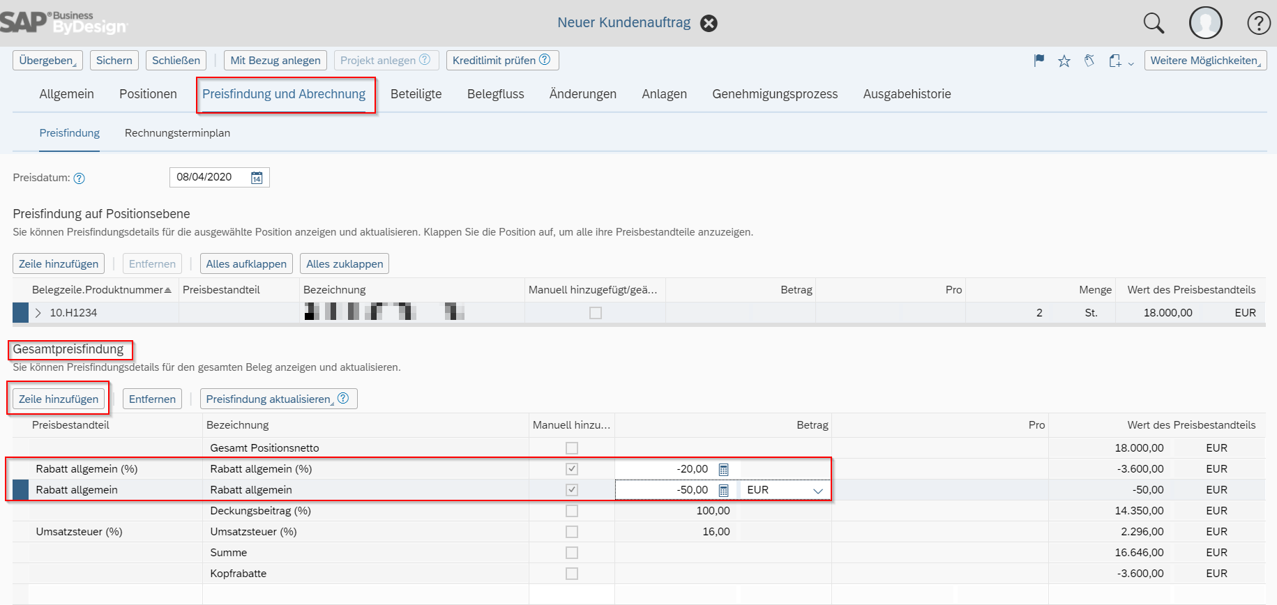 Um die Funktion aktiv zu nutzen, kann der User beispielsweise einen neuen Kundenauftrag anlegen und in der Sicht „Preisfindung und Abrechnung“ kann ein Festpreisnachlass bzw. einen prozentualen Rabatt gewährt werden. Die manuell eingegebenen Rabatte werden direkt in der Gesamtpreisberechnung berücksichtigt.